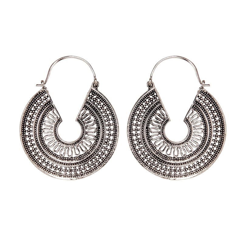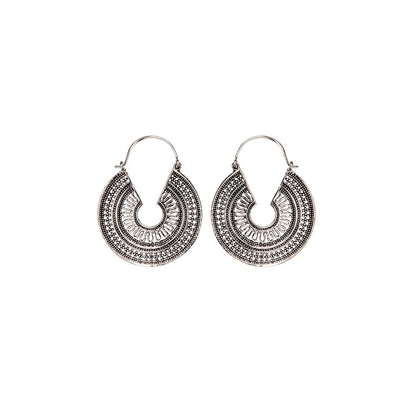 - MADE WITH LOVE - Silver tone brass embellished hoop earrings. Width 40 mm. Length 40 mm. Reminiscent of ancient Egyptian, Greek or Roman jewellery, these antique-style silver dangle earrings are everything. Made of solid brass, they shine like silver and will retain their luster as brass is very easy to clean.