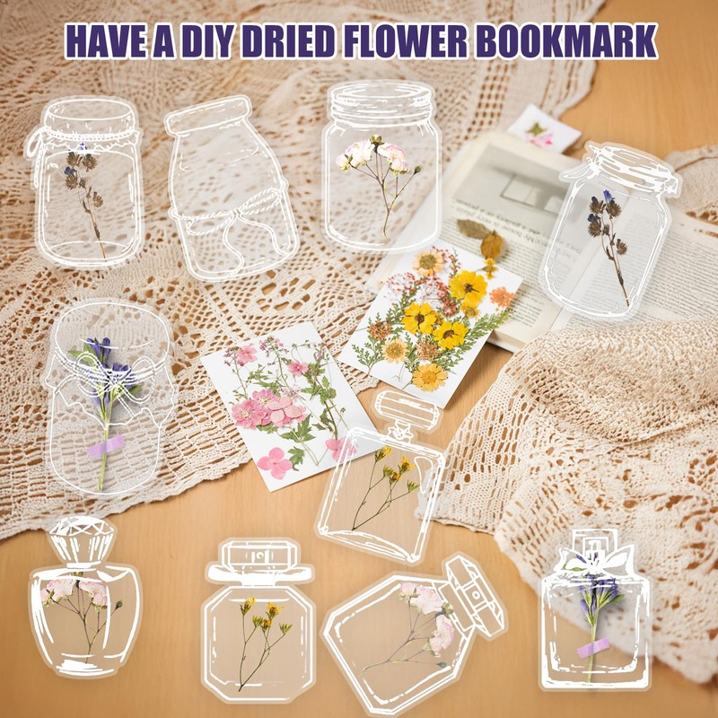 - [Quick and Easy to DIY]: Unleash your artistic flair by crafting your own bookmarks. Simply peel back the clear bottle bookmarks with tweezers or your fingertips, insert your chosen elements into the transparent dried flower bookmarks, and then reseal it with the sticker or a card.