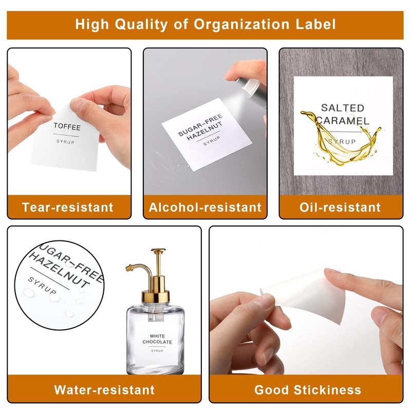 - WATERPROOF LABELS - Our coffee syrup dispenser label stickers are made of high quality PVC material, the font is not easily scratched, the color is not easily faded, oil and water resistant, you can use them with confidence.