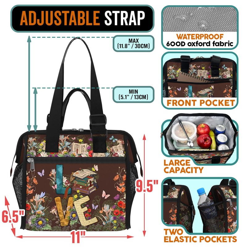 84hoods Insulated Lunch Bag for Women. Gift for Book Lovers and Librarian. Large Lunch Box for Work Office Travel Picnic with Adjustable Strap. Love Books.