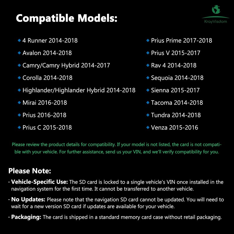 - Vehicle-Specific Use: The SD card is locked to a single vehicle's VIN once installed in the navigation system for the first time. It cannot be transferred to another vehicle.