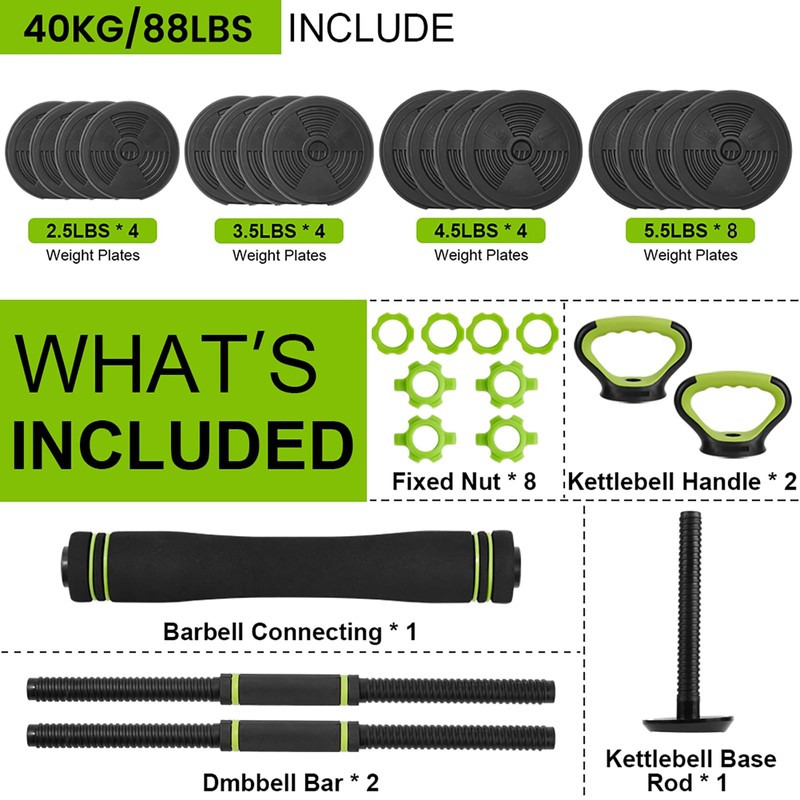 • 44 Lbs Package List: 4 x 2.5 lbs weights, 4 x 3.5 lbs weights, 4 x 4.5 lbs weights, Dumbbell bars x 2, Barbell connector x 1, Kettle bell bar x 1, Push-up handles x 2, buckles x 8.