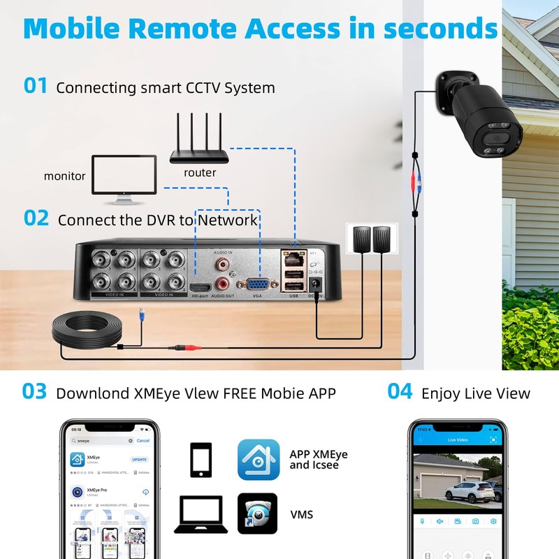- 【Remotely Anytime and Anywhere】: Whenever real threats are detected, immediate pushes pop up on your phone, and you can check it out via 3G/4G/Wi-Fi.Using the latest Cloud Technology, With the free APP, You Can Remote View or via Smart Phones, Tablets, Notebook or PC.Install download “XMEye” View free mobile APP through scanning QR-code or download from APP store. However far away you are from home, this reliable security system secures your peace of mind day&night.