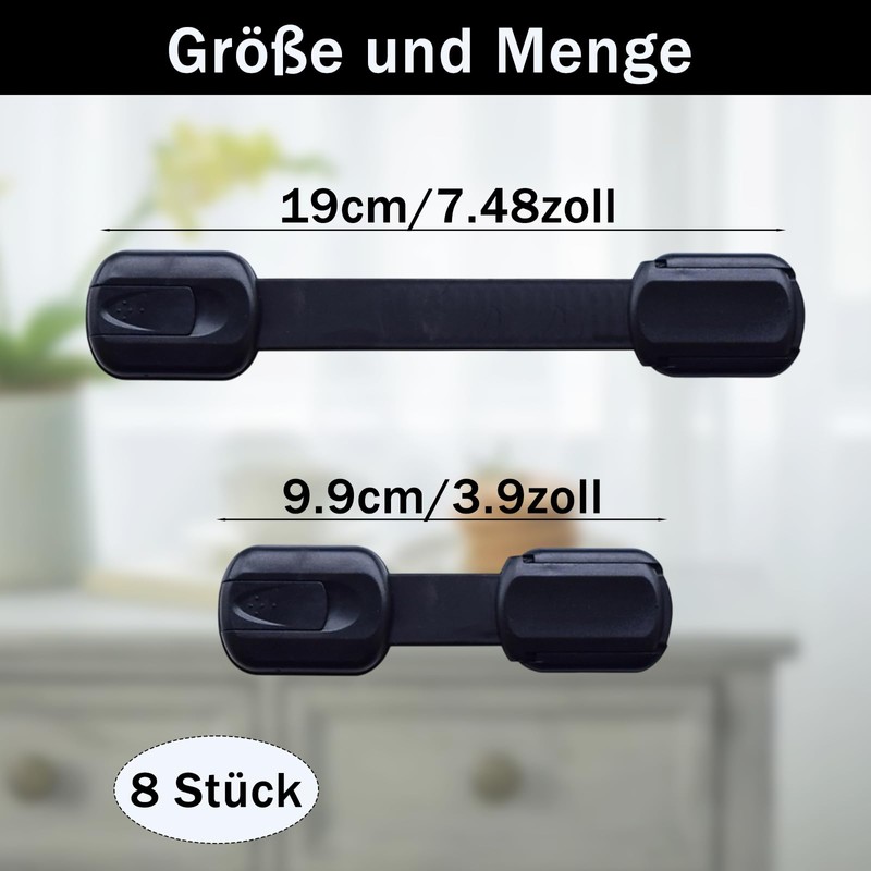 Sie erhalten 8 schwarze Kindersicherungen, die Schlosslänge ist bis 190mm verstellbar, was für beste Passform sorgt und für Möbel verschiedener Größen geeignet ist. Es wurde für Familien mit Babys und Kleinkindern entwickelt und verhindert wirksam, dass Kinder versehentlich Schubladen oder Schränke öffnen und an gefährliche Gegenstände gelangen. Es eignet sich nicht nur für Familienbereiche wie Küche und Bad, sondern auch für diverse Orte wie Kinderzimmer und Abstellräume und sorgt so für umfassende Sicherheit im Zuhause