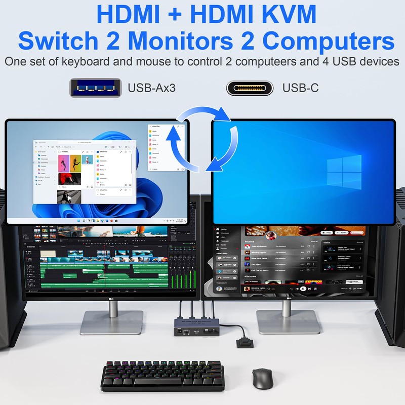 2 port HDMI KVM Perfects for hooking up 2 desktops or laptops to share 2 monitors and 1 set of keyboard, mouse for home office setup, gaming consoles and streaming devices.