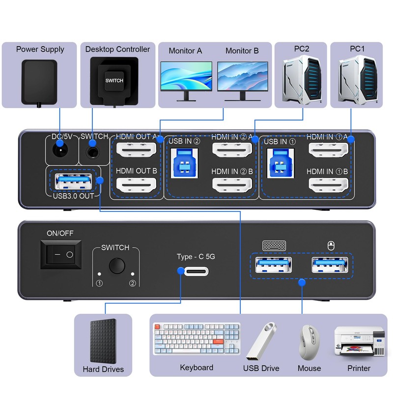 This Dual Monitor HDMI KVM switch has 4 USB 3.0 ports (3 USB-A+1 USB-C) for sharing mouse, keyboard, USB flash drives, printer, and other USB devices. USB 3.0 offers data transfer speeds of up to 5Gbps, which allows faster data transfer to make work more efficient.