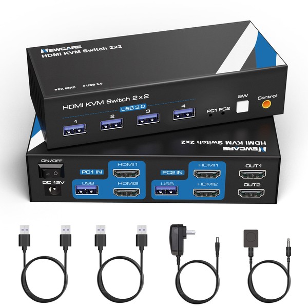 8K KVM Switch HDMI 2 Monitors 2 Computers, NEWCARE HDMI KVM Switch Dual Monitors 2 Computers Share 4 USB 3.0 port, 4K@120Hz HDMI KVM Switch 2 Port for 2 PC, Desktop Controller and 2 USB Cable Included