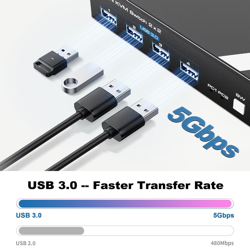 - Two Computers Sharing 4 * USB 3.0: KVM switch 2 monitors 2 computers has 4 USB 3.0 ports, so you only need connect one set keyboard, mouse, printer, USB disk to control 2 computers. Support wireless keyboard and mouse, no need install any driver, just plug and play. The USB 3.0 port's transfer data rates max up to 5.0 Gbps per second, which it's faster 10 times than USB 2.0 port.