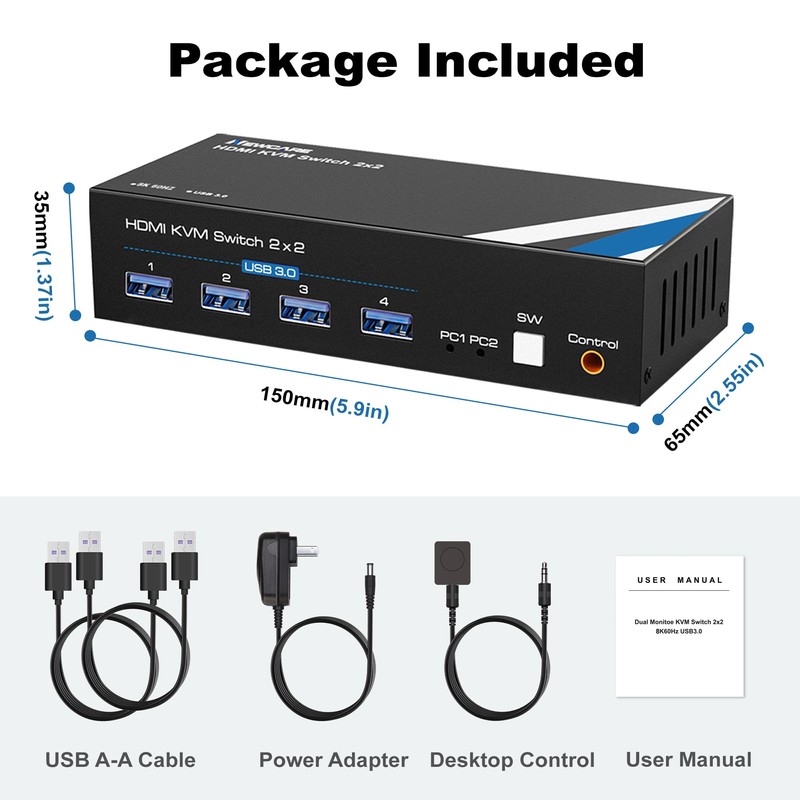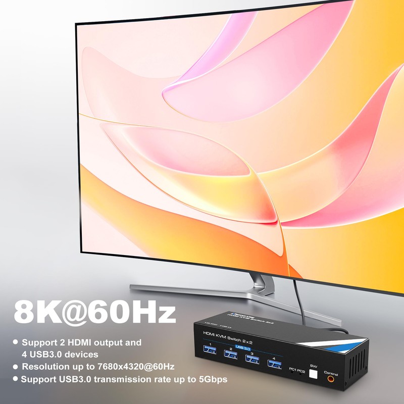 - HDMI KVM Switch Dual Monitor: 8K@60Hz HDMI KVM switch 2 in 2 out support 2 PCs sharing 4 set USB 3.0 devices like mouse, keyboard, printers, scanners, USB drives. 2 PCs could be control by one sets USB devices, without constantly plug cables, make your desktop more tidy. It's perfect if you need to switch between two PCs, which can improve your work efficiency.