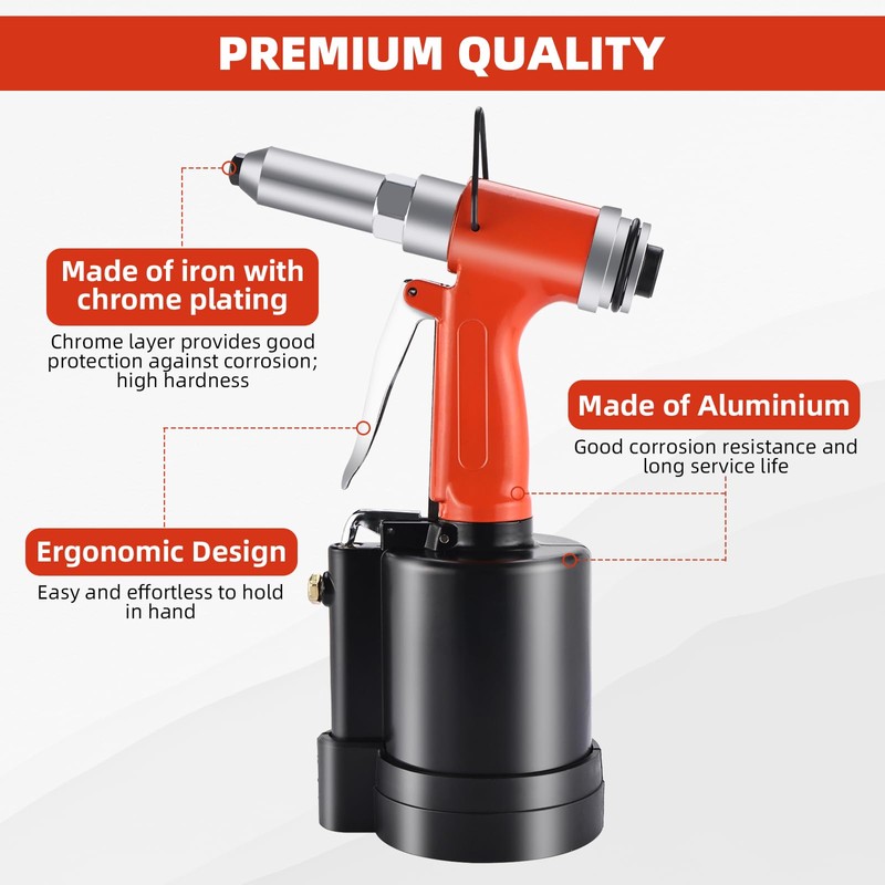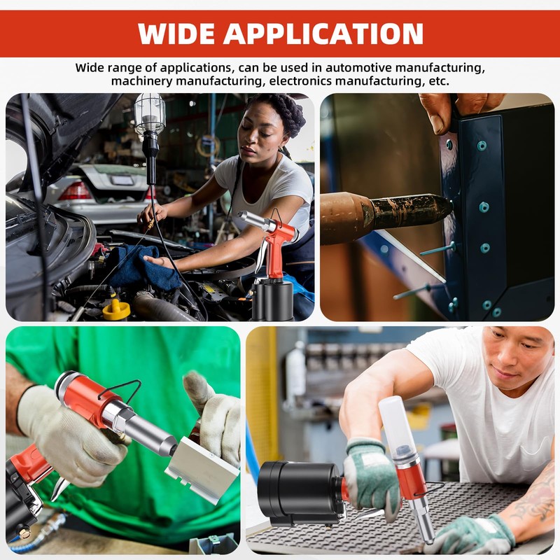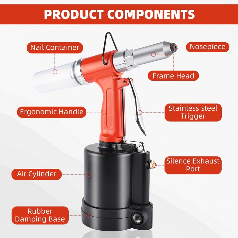 8MILELAKE Pneumatic Pop Rivet Gun Air Riveter Tool Heavy Duty Riveting Machine with 5 Sizes Nosepieces and 3 Claw Clips
