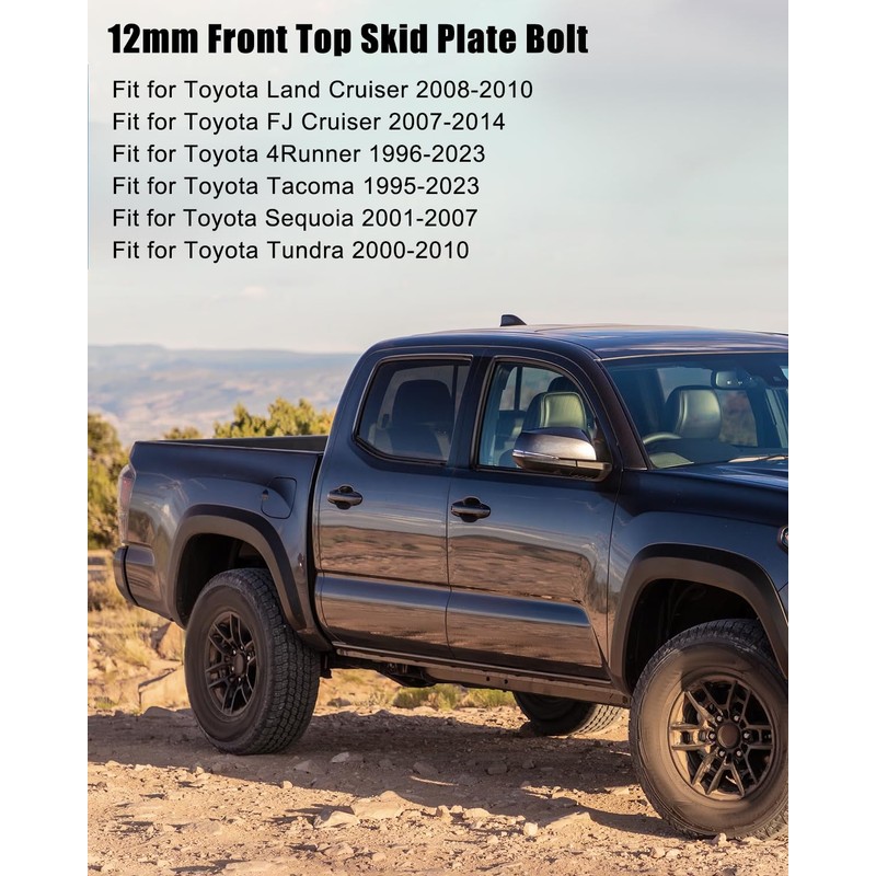 - Wide Compatibility: 12mm Top front skid plate bolts fit for Toyota 4Runner 1996-2023, fit for Toyota Tacoma 1995-2023, fit for Toyota Tundra 2000-2010, fit for Toyota FJ Cruiser 2007-2014, fit for Toyota Land Cruiser 2008-2010, fit for Toyota Sequoia 2001-2007