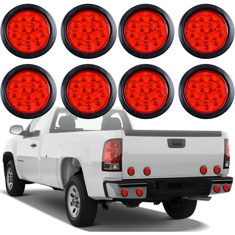 8PCS 4" Inchs Round Trailer Lights, Super Bright Red 12 LED Brake Turn Signal Tail Lights with IP67 Waterproof Rubber Gaskets for Boat Trailer Truck RV, Red Light - Red Lens