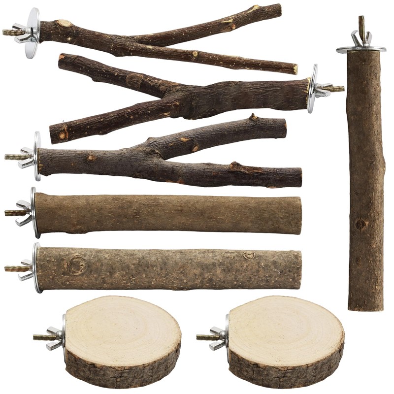 - Set Combination: This parakeet toys set combination includes 8 wooden parrot resting racks, among which 3 are caged multi-branch resting racks, 3 are wooden parrot resting racks, and 2 are natural circular wooden resting platforms. There are sufficient wooden resting platforms for birds to rest and play on a daily basis. With these three types of perches, you can create a natural habitat for your feathered friends, allowing them to live as if they were in nature