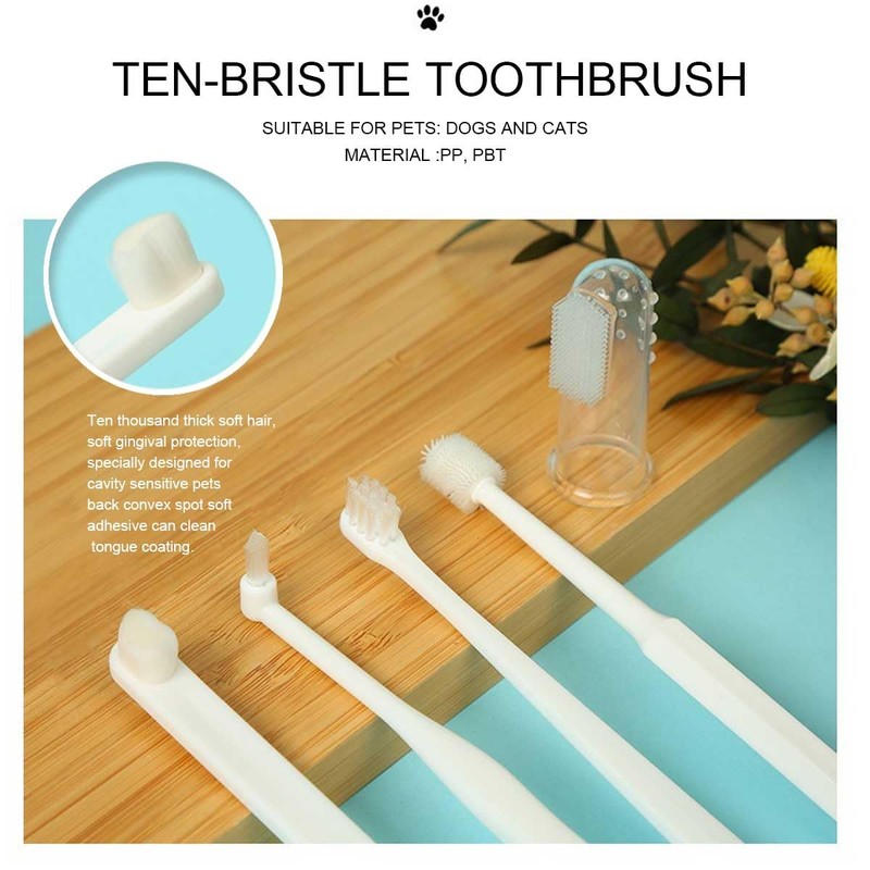 - 【Complete Dental Care Set】This 8-piece pet toothbrush kit includes your need for your pet's oral hygiene: 1 Ultra-Fine Bristle Toothbrush (gentle on gums, suitable for cavity-sensitive pets) 1 Pointed Toothbrush (for deep cleaning between teeth and hard-to-reach areas) 1 Soft-Bristle Toothbrush (effective for daily cleaning) 1 360° Toothbrush (all-around cleaning with nano bristles for efficiency) 4 Silicone Finger Toothbrushes (soft, flexible, and easy to use for gentle cleaning)