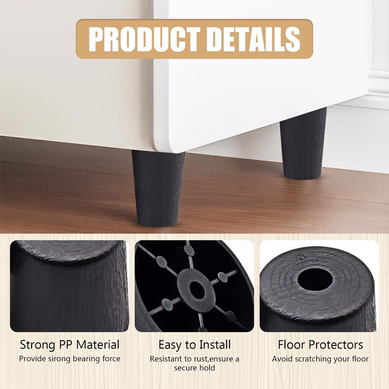 - 【Conical Structure】This plastic feet for furniture adopts a classic conical design with a smooth and rounded bottom edge, which can effectively reduce the friction between the furniture and the ground. Even if the furniture is moved, it will not produce harsh noises, let alone scratch the floor. Using this set of cabinet feet not only improves the stability of the furniture, but also quietly guards every morning and late night, bringing a comfortable and undisturbed home experience