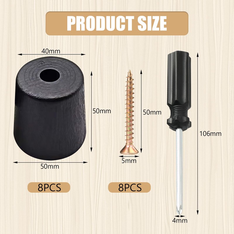 - 【Set Content】This set includes 4 table feet and 4 screws, with 1 screwdriver, the size is precise and practical: the furniture foot size is 50*40*50mm, the screw length is 50mm, and the total length of the screwdriver is 106mm. The standardized structure allows each chair rubber feet to fit the furniture without loosening or shifting, thereby improving the stability and security of the furniture.