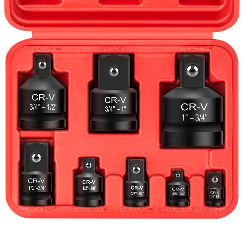 - 【What's Included?】 Reducer sizes include: 1"F to 3/4"M, 3/4"F to 1/2"M, 1/2"F to 3/8"M, and 3/8"F to 1/4"M. Adapter sizes include: 1/4"F to 3/8"M, 3/8"F to 1/2"M, 1/2"F to 3/4"M, and 3/4"F to 1"M. It provides the necessary sizes for easy socket transitions.