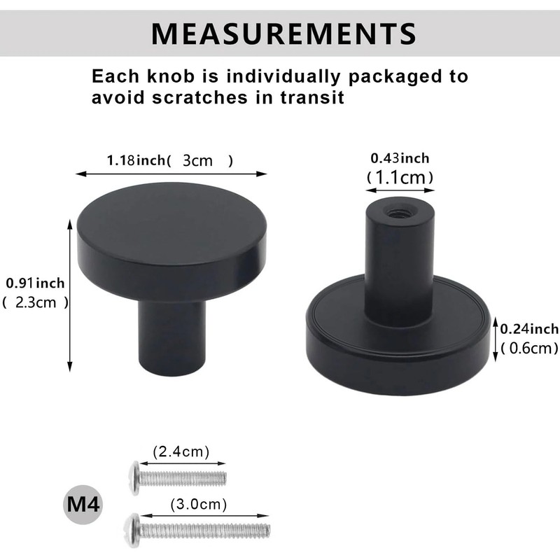 - Package Includes: Each knob comes with 1 PC* 2.4cm screw and 1 PC *3cm” screw Easy and quick installation No need for professional help—just a few easy steps to upgrade your cabinets and drawers