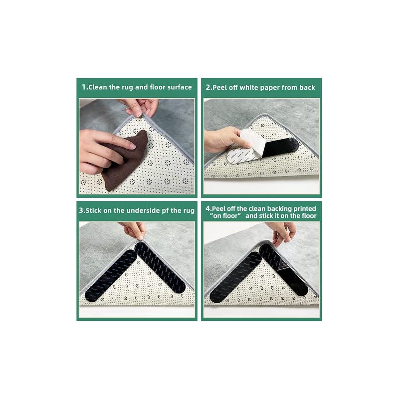 - Easy Installation: Just peel off the protective film of the carpet grippers, stick them to the underside of your rug, and press firmly. You can complete the installation in less than 30 seconds. You can also cut a suitable length of double-sided carpet tape and paste them on the edge of other rugs for more reinforcement. We suggest that you should clean and dry the carpet and floor first for the best result.