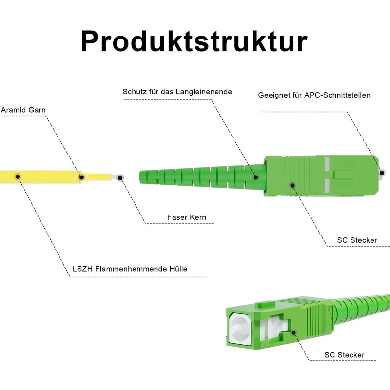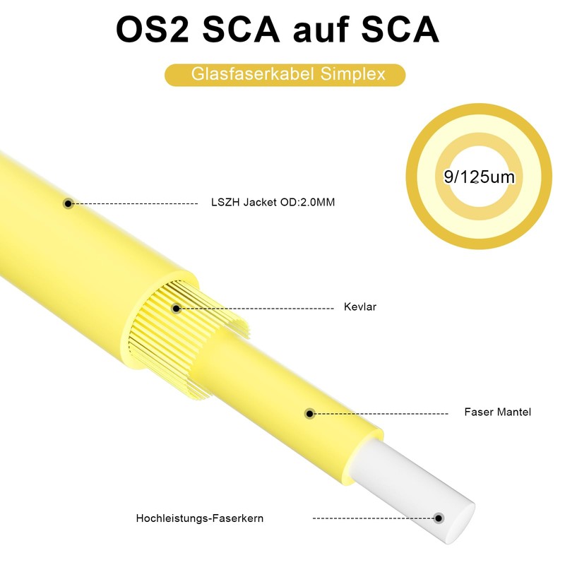- Structural design: you will get 8ternityFiber OS2 fibre optic cable SCA to SCA 0.5 m, 1 piece, O.D. : 2.0mm; Pattern: 9/125um with a layer of aramid as the stress reinforcing unit, and a high-performance flame retardant LSZH jacket with good flame retardant properties.