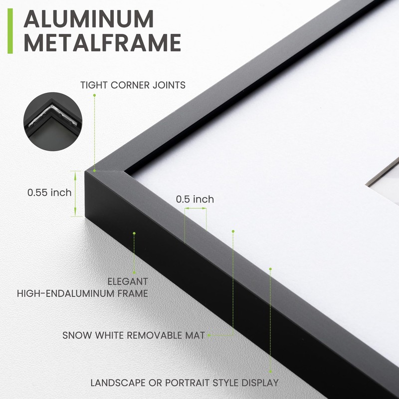 - Aluminum Picture Frames - Display your special monments in style with this 8x10 metal frame crafted from premium aluminum alloy. With a versatile size that display 8x10 inch pictures frames with a mat or 5x7 inch pictures without one. It's lightweight yet sturdy and durability with a superior quality finish, give you a perfect protection of your frames for preserving your memories.