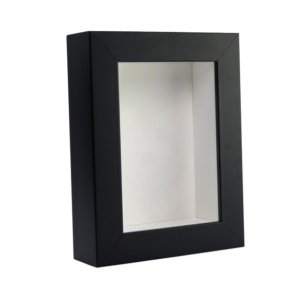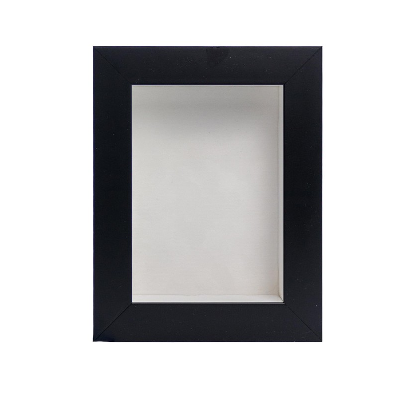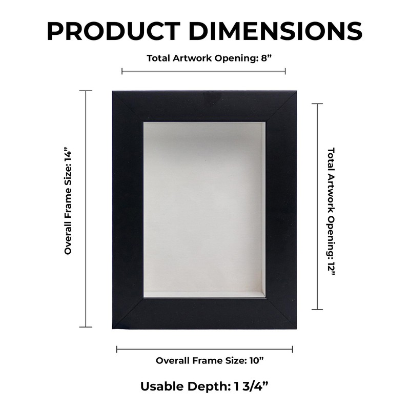 - Black wood shadow box frame with interior dimensions of 8x12 inches with 1 3/4 inches of usable depth. UV-resistant, frame-grade acrylic protective front.