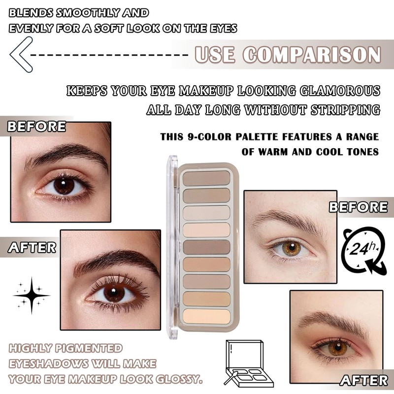 - 🎁【Popular Colors】Eyeshadow palette has 9 colors to choose from, from light to dark, you can mix and match all kinds of colors, reasonable and perfect color matching, so that you have a different makeup look every day.