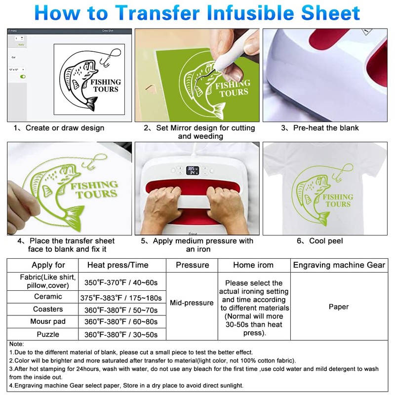 - Wide applications: our infusible ink film is suitable for most light materials such as white or light blue, light pink, light yellow and other light polyester fabrics. Personalized Mugs, Coasters, Mouse Pads, Tote Bags, Canvas, Leather, Shirts & Clothes- Let your imagination run wild and surprise your family and friends.