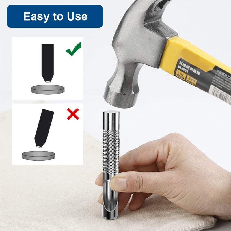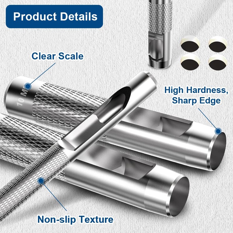 - Non-slip design: the leather punch is exquisite in appearance, angular and hard, leather punch with an anti-slip pattern on the handle, which does not slip off easily, making it safer to use. The hemispherical recessed punch cleverly protects your equipment from scratches and damage.