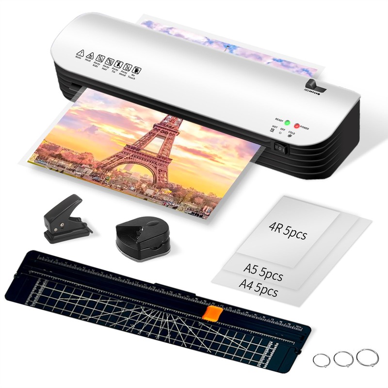 - 【6-in-1 Laminating Set】Including laminator machine, 15 pouches (A4*5/A5*5/4R*5), hole punch, binding ring, paper trimmer, and corner rounder. Ready to use right out of the box—no extra parts needed.