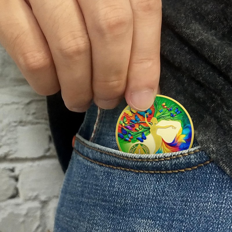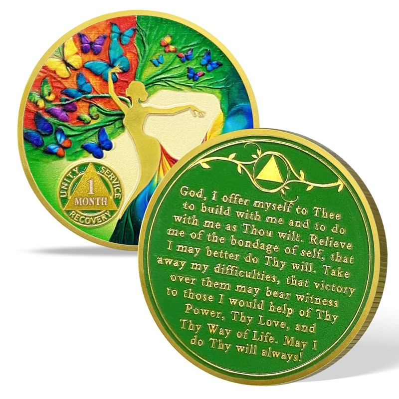 - Elegant Design Front Design: The front of the coin showcases a graceful Dancing Tree Woman surrounded by vibrant butterflies and colorful branches, symbolizing growth, freedom, and transformation. A golden frame encircles the "9 Month" engraving, marking this sobriety milestone. Back Design: The reverse side features the Serenity Prayer within a golden border, offering daily inspiration and reminding individuals of the core principles of their recovery journey.