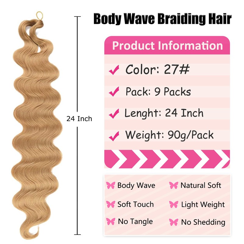 - Product specifications: Pre Feathered Body Wave Braiding Hair available in various sizes(10/14/18/24/30 Inch), multiple colours(1B#/27#/30#/350#/613#T30#/T27#/27613#). 9 Packs/lot, enough For A Full Head. Braiding Hair in various colors and sizes can meet all your needs.