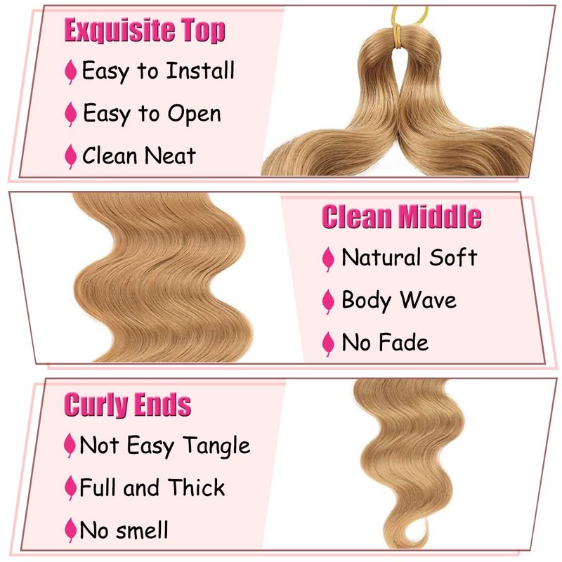 - Product Advantages: Pre Feathered Body Wave Braiding are very soft,smooth and natural,the hair doesn't fall off easily, separates easily, saves time when braiding, doesn't tangle easily when using, has no smell,no harm to the skin. Can be used for party, daily use,travel, wedding,night club, graduation ceremony or mother's day gift etc.