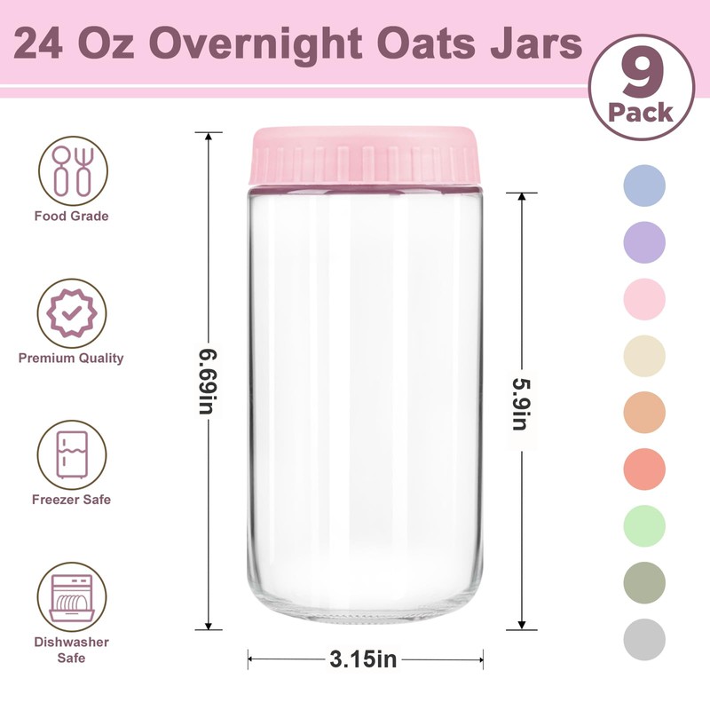 9 Pack Overnight Oats Containers with Lids, 24 oz Mason Jars with Airtight Li...