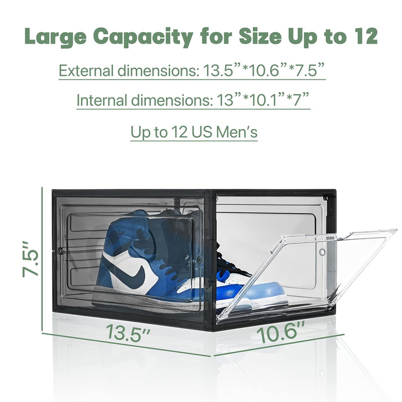 - Sturdy X-Large Shoe Box: Clear shoe box is made of heavy-duty plastic sides. Its thick design ensures its reliability and durability.Each box measures 13.5'' x 10.6'' x 7.5"