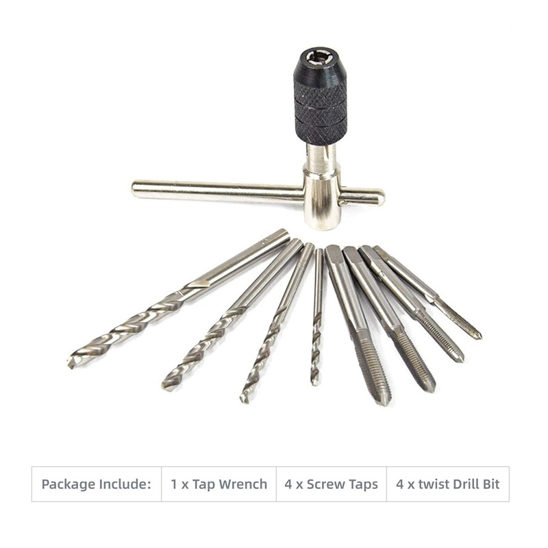 It includes 1 piece T-shaped tap wrench, 4 pieces taps and 4 pieces twist drill bit.