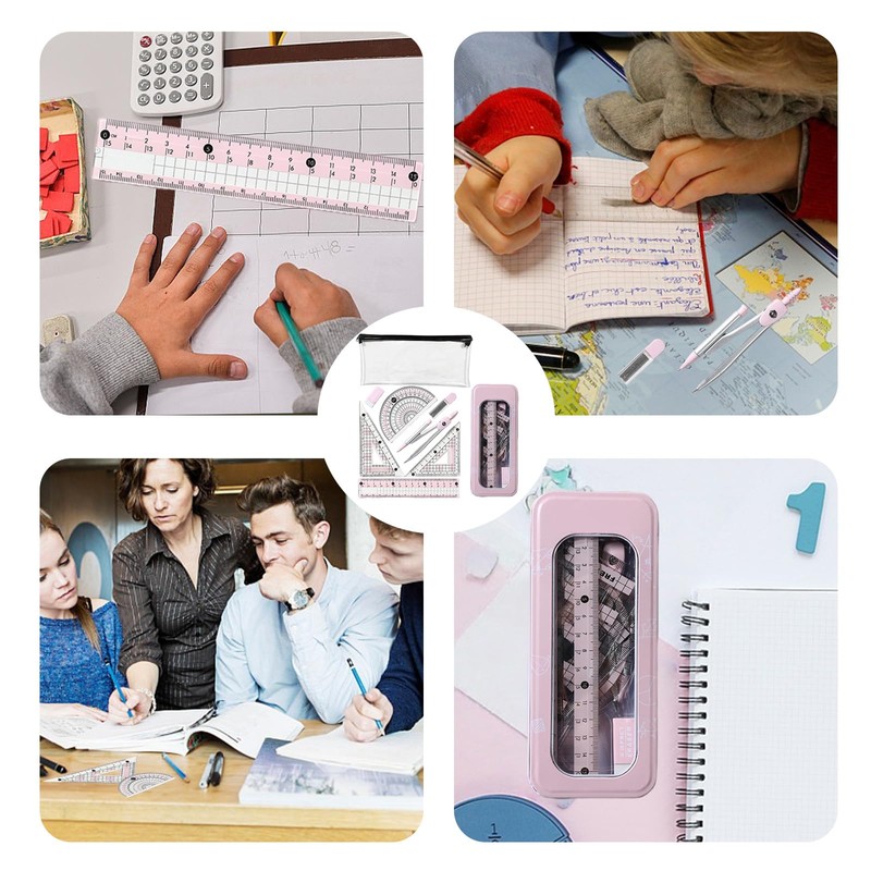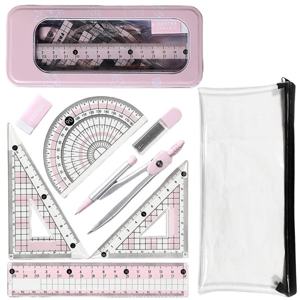 - 【Exam Stationery Set】You will receive 9 pcs math set, This includes: 1 box, 1 compass, 1 lead core, 1 eraser, 1 15CM ruler, 1 45 ° triangular ruler, 1 60 ° triangular ruler, 1 measuring angle ruler, and 1 transparent pen case.