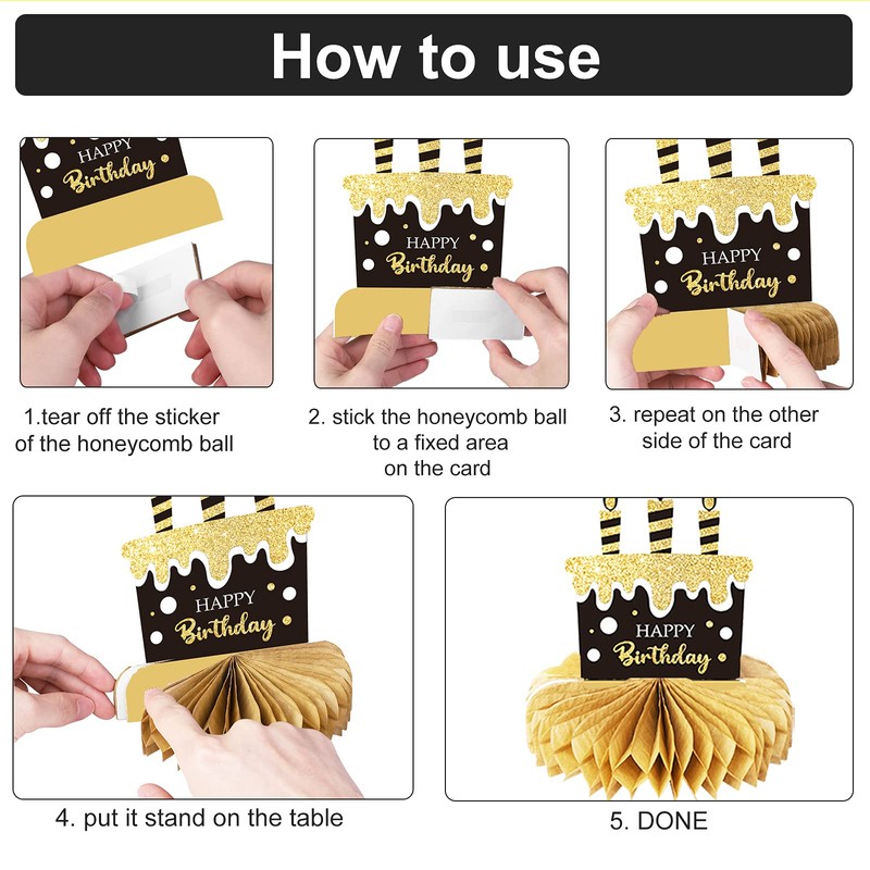 - How to use: Step1, tear off the sticker of the honeycomb ball. Step 2, stick the honeycomb ball to a fixed area on the card. Step 3, repeat on the other side of the card. Step 4,finally put it stand on the table. It's so easy that you can save a lot of time .
