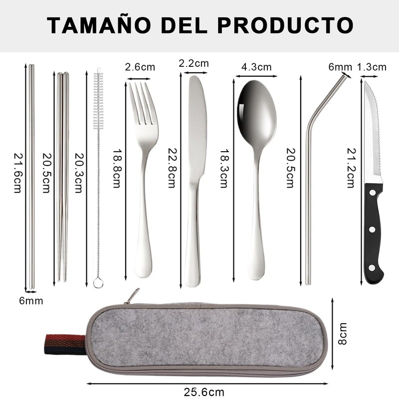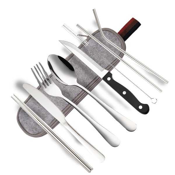 - 【Juego de 9 piezas de gran valor】Juego de cubiertos portátiles incluye cuchillo de mesa, tenedor de mesa, cuchara de mesa, palillos chinos, cuchillo para carne, cepillo limpiapajitas, pajita recta, pajita curva y estuche de transporte. Este juego de cubiertos de viaje de camping es compacto y ligero, fácil de llevar.