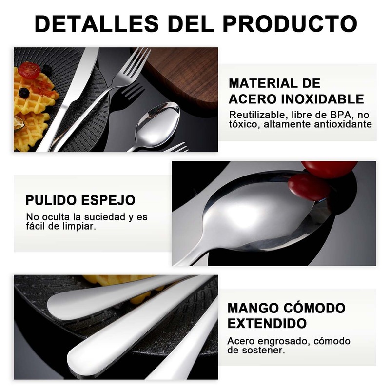 - 【Materiales de alta calidad】Set de cubiertos de acero inoxidable, elaborados de acero inoxidable de grado alimenticio, sin BPA, no tóxicos, no utilice más los cubiertos de plástico que contaminan, se rompen y son de solo un uso, cuentan con una forma ergonómica y duradera para uso diario, todos los cubiertos son aptos para lavavajillas.