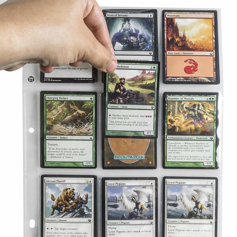 These pages are the classic 9-pocket standard, most common in trading card games (TCG) such as Magic the Gathering (MtG), Yu Gi Oh, and Fantasy Flight LCGs as well as basketball, baseball, football, and other sports cards. The perfect pages for card holders, baseball card binders, and other 3-ring binders! Pages are configured into three rows of three slots. A great holiday gift for trading card collectors, sports card fans, and more.