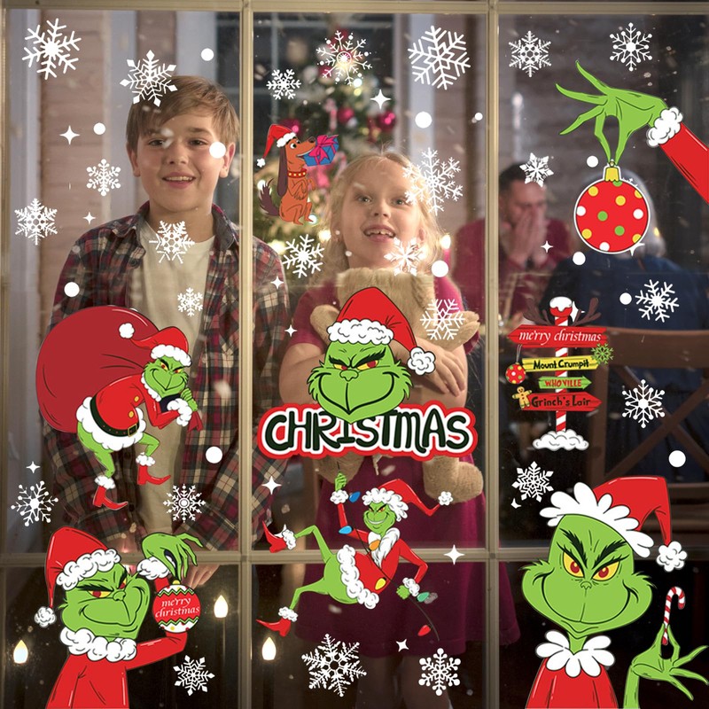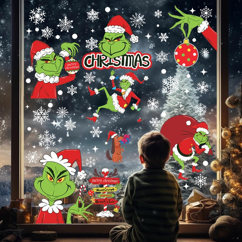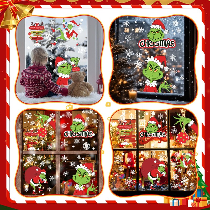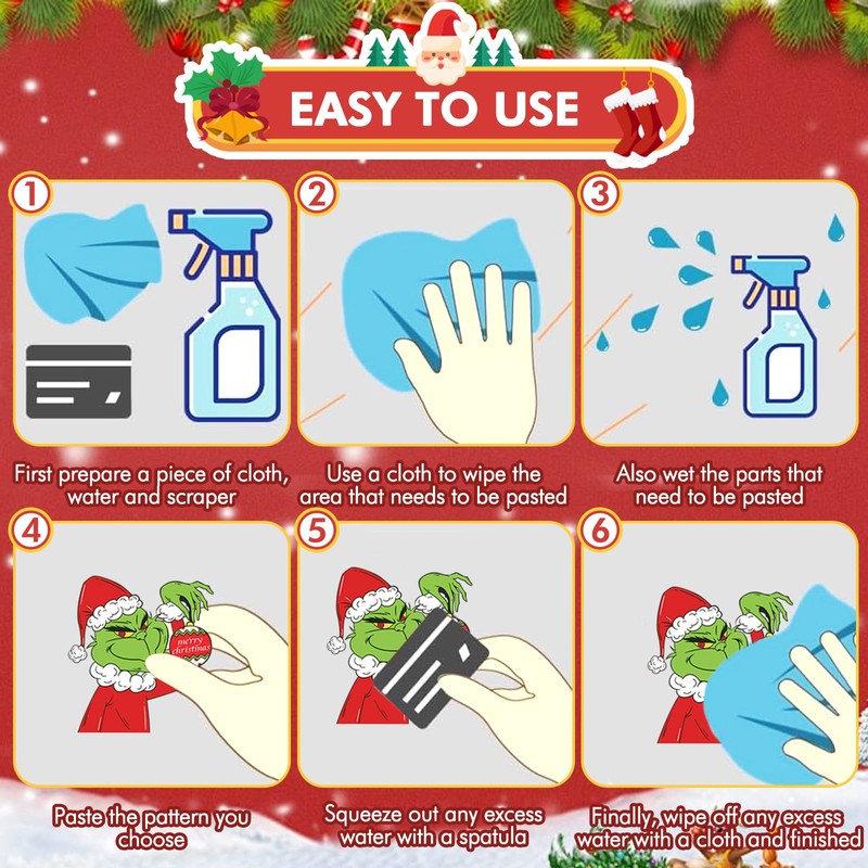 - Easy to Use There is no glue for Grin-ch Christmas stickers. Before use, you can spray some water on the window so that the window stickers stick more firmly to the window, easy to peel off, and the window stickers can be reused