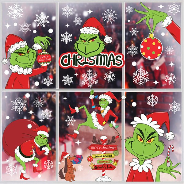9 Sheets Grin-ch Window Stickers Christmas Grin-ch Window Stickers, Winter Window Christmas Decoration, Double-Sided Snowflake Stickers for Christmas Party Home Window Decoration