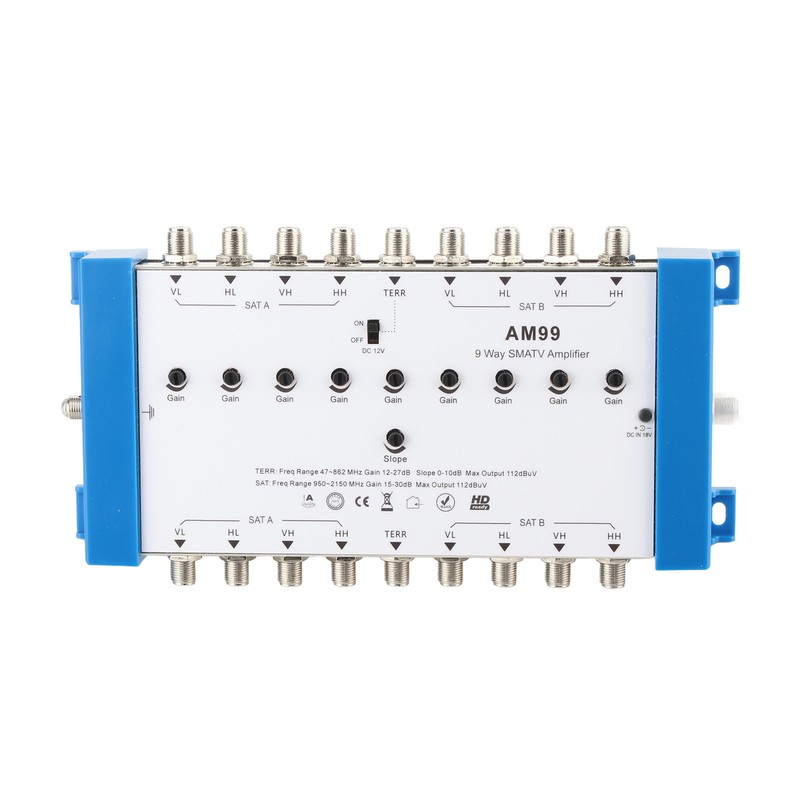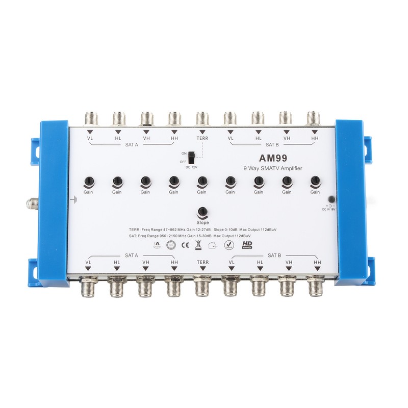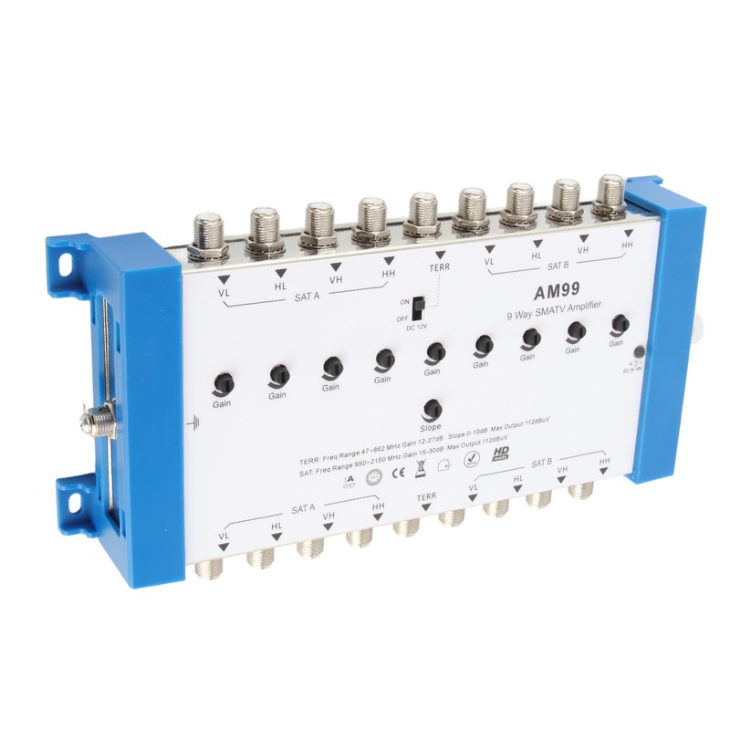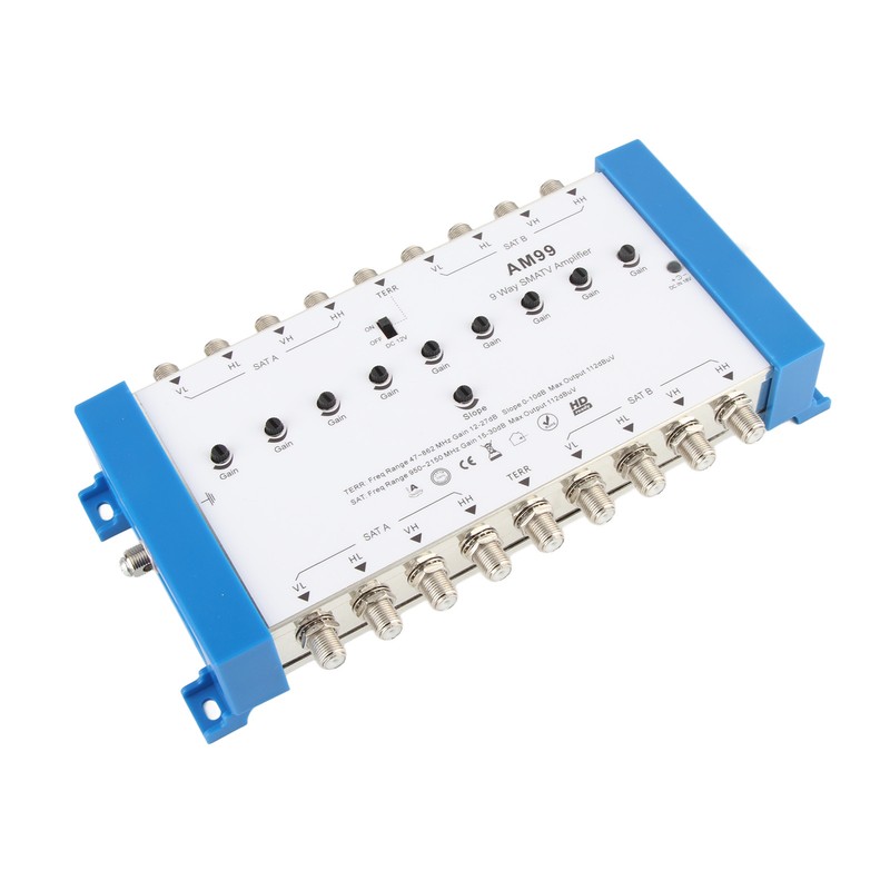 1、Satellite IF, Input and Output: Satellite TV splitter with 8 satellite IF and 1 terrestrial TV input and output. 2、High Isolation and Return Loss: High performance 9 way SMATV amplifier with high isolation and return loss. 3、Input and Output Levels: 9 way satellite TV amplifier with high input level and high output level. 4、DC Pass Through: 9 way satellite TV amplifier with output port, input port DC pass through. 5、Unique Design: Satellite TV splitter has a metal case with plastic bracket, designed for indoor use.