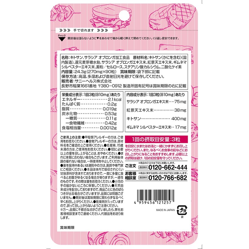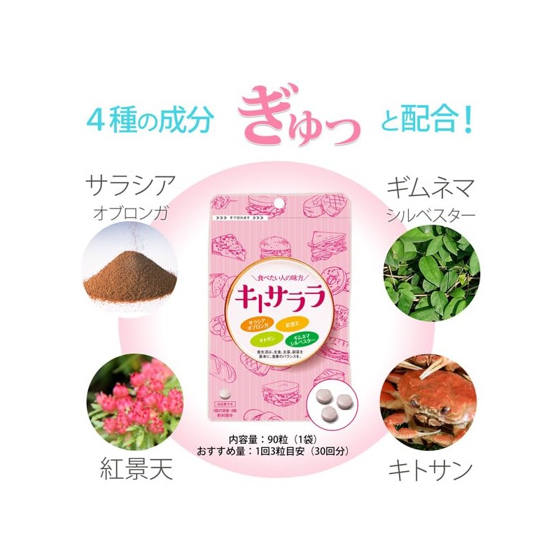 「サラシア オブロンガ」をはじめ、「キトサン」「ギムネマ シルベスター」などこだわりの配合を実現!急な食事のお誘いも コレがあれば楽しめる!と好評です。