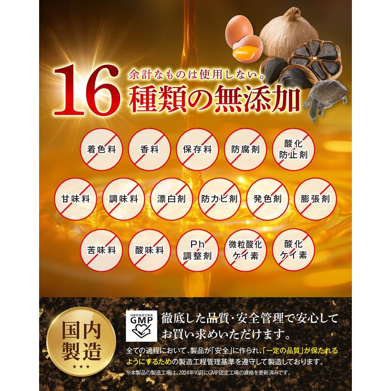 - 🧄【やさしさにこだわった16種の無添加】毎日の習慣だからこそこだわった16種の無添加。着色料、香料、保存料、防腐剤、酸化防止剤、甘味料、調味料、漂白剤、防カビ剤、発色剤、膨張剤、苦味料、酸味料、Ph調整剤、微粒酸化ケイ素、酸化ケイ素を無添加。🧄【国内GMP認定工場で製造】黒ニンニクとすっぽんのチカラは、品質管理に徹底的に配慮した国内GMP認定工場で生産されています。すべての過程において「一定の品質」が保たれるように生産工程を管理し、製造しております。