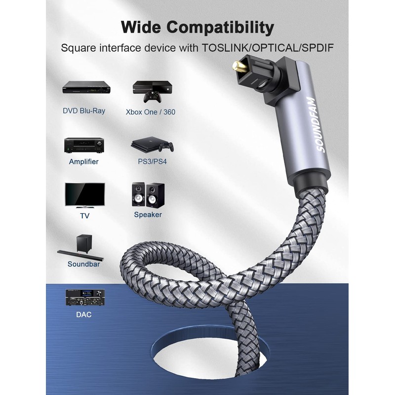 📢This dual 90 degree optical audio cable is compatible with all devices that have a standard TOSLINK square port connection. Please check whether your device's port is a standard TOSLINK square port before purchase.