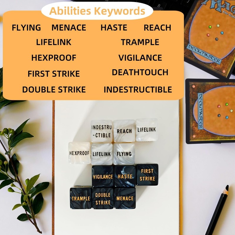 - 【Dice Set Includes】There are 90 dice in total, with 24pcs MTG keywords D6 dice (FIRST STRIKE, VIGILANCE, TRAMPLE, HASTE, DOUBLE STRIKE, MENACE / INDESTRUCTIBLE, FLYING, HEXPROOF, LIFELINK, DEATHTOUCH, REACH) and 18 pieces -1~-6 dice counters & 18 pieces +1~+6 dice counters, 12 dice with keyword patterns, accompanied by a card explaining the keyword patterns, 12 pieces marble colour shield dice counters(6pcs 1~6 & 6pcs 7~12) and 6 pcs 20mm d20 dice, a big dice bag
