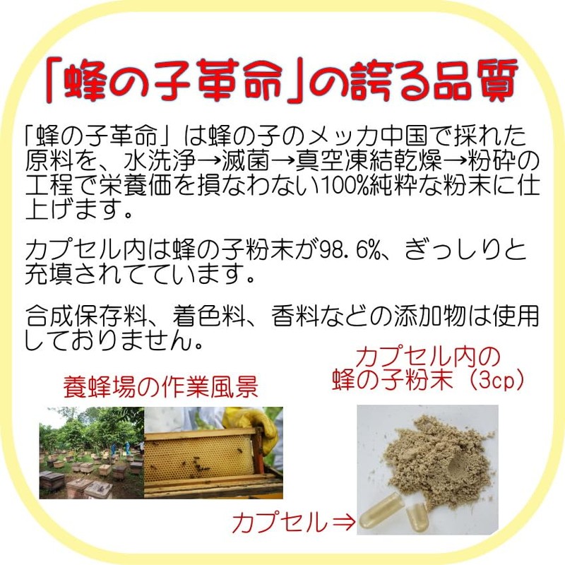 - 「蜂の子革命」は1日3粒で1020mgもの高品質の 蜂の子 を摂取する事ができます。