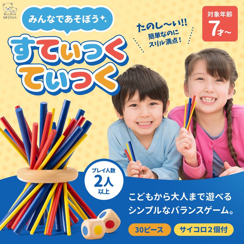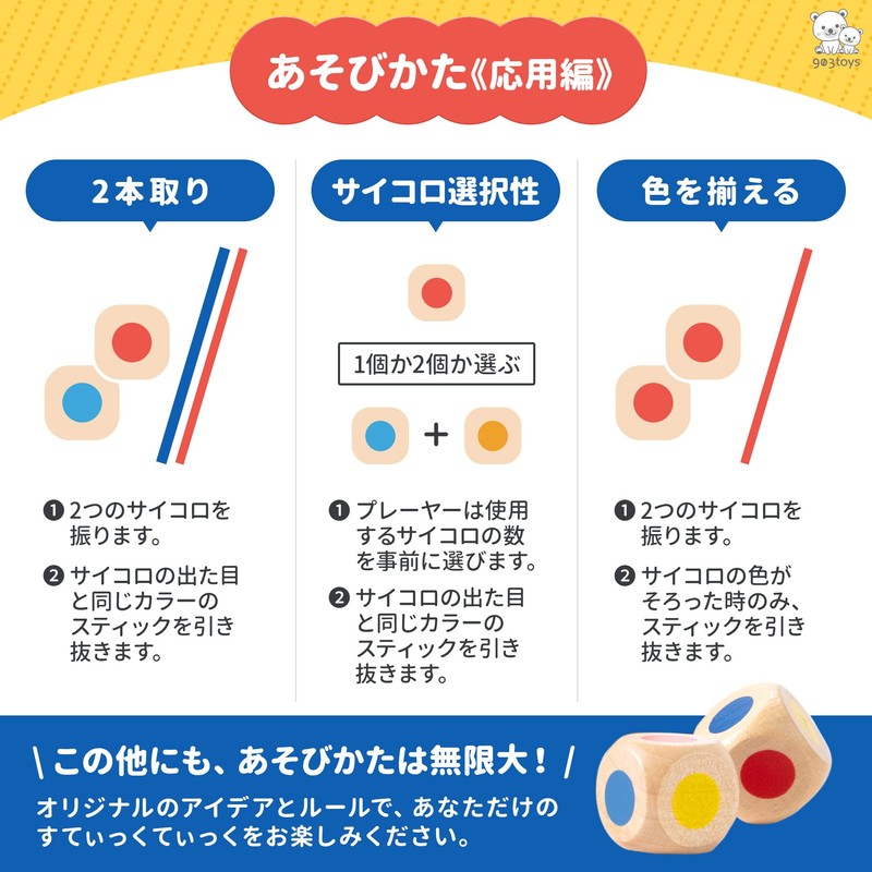 - 【How to Play】 Hold all the sticks together with one hand, slide the wooden ring through the bundle and lower down to the middle, slowly release your hand from the bundle and stand in balance. When the whole stop working, the game is ready. Players take turns to throw the dice and take out the color of the dice they come out with care not to destroy the overall balance. When the entire game is collapsed (or if only three sticks remain), the game is finished and the highest scores wins. (3 blue, 1 red, 1 yellow, 1 last stick, not for calculation. )